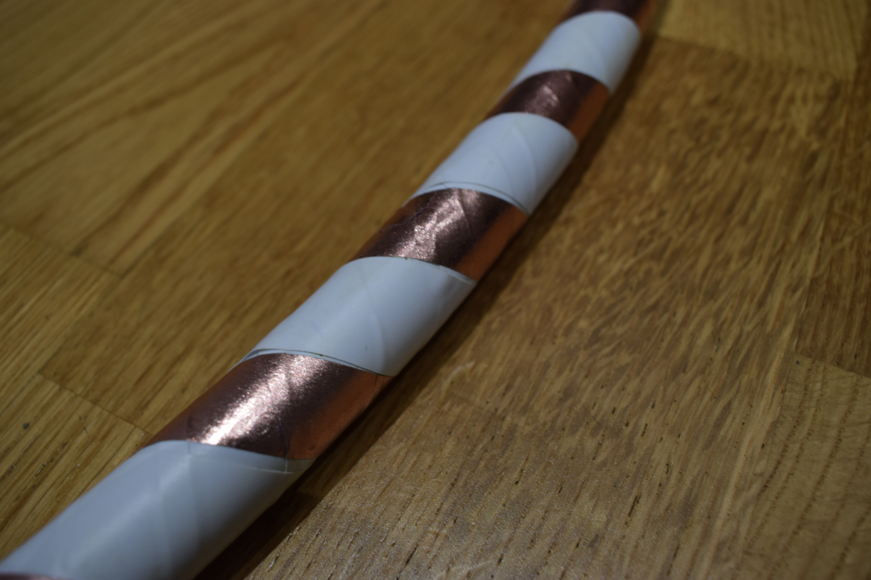 The first layer consisted of white insulation tape This was purely for weighting. After that, it was time for the top Layer. I used rose-gold washy-tape and more insulation tape. Washy-tape is not recommended for hoops though, as it gets scratched quite easily. In the end, the hoop looked quite nice, although the spiral wasn’t completely even. Hopefully I’ll be able to make a hooping video soon 🙂 .
